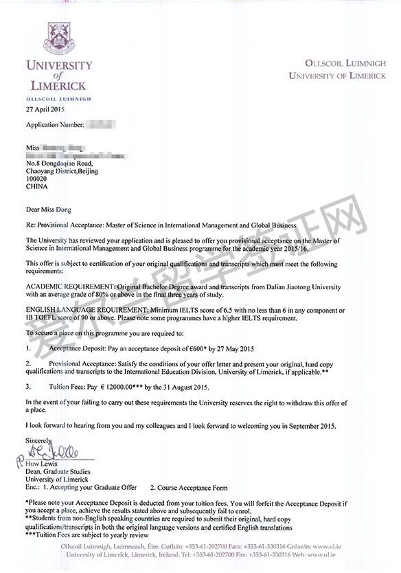 恭喜秦同学获得利莫瑞克大学录取OFFER