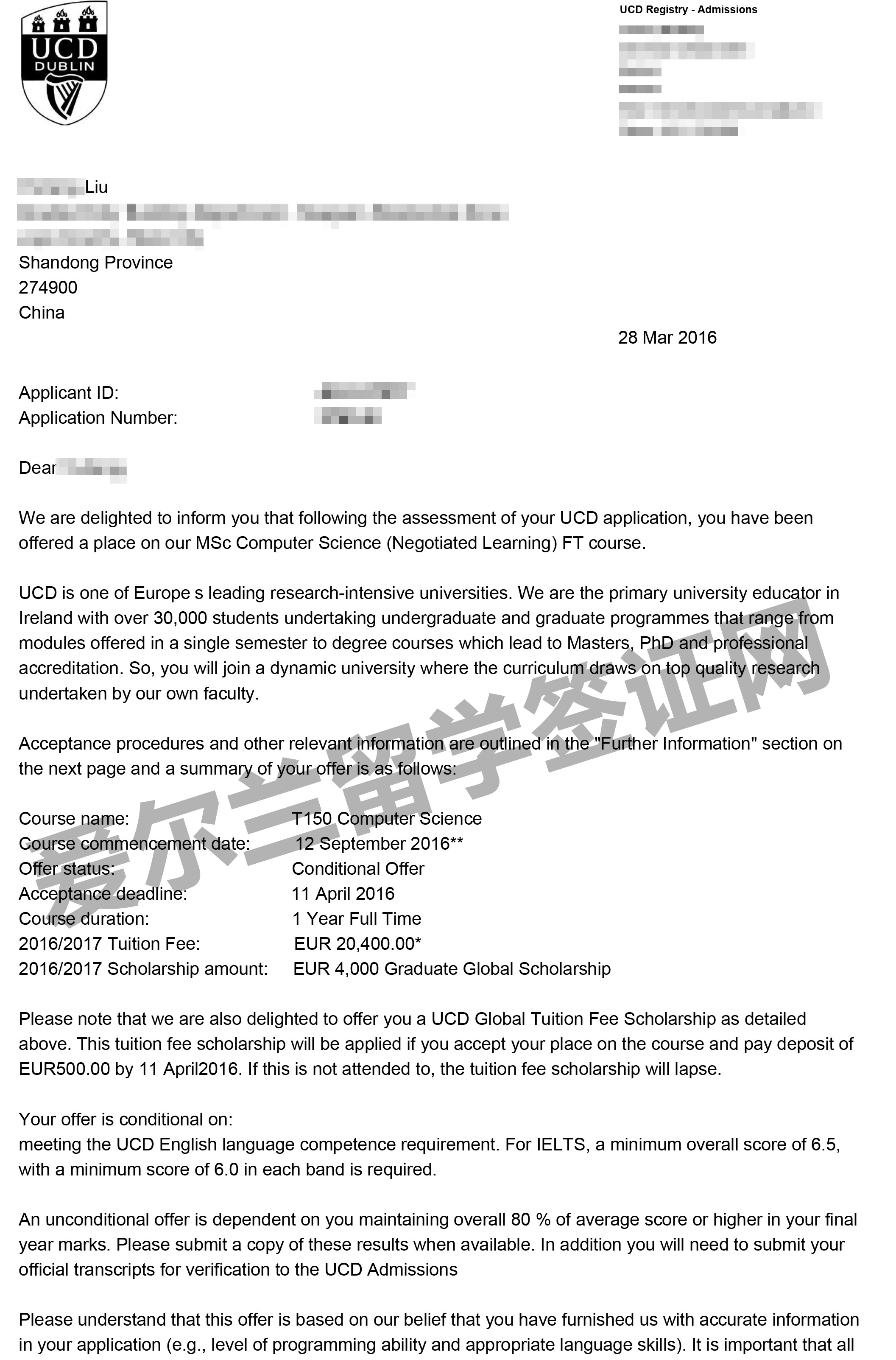 经过兆龙留学-爱尔兰留学签证网老师的努力,成功为刘同学申请到爱尔兰都柏林大学计算机科学硕士OFFER,并获得4000欧元的奖学金,以下是他的offer分享,在此祝他留学之路一切顺利!