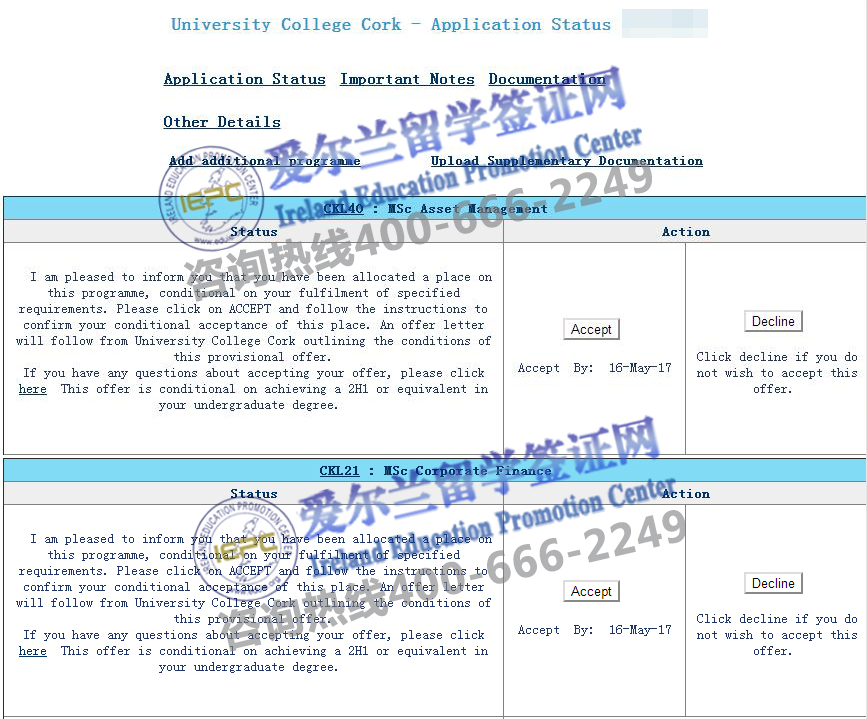 经过兆龙留学-爱尔兰留学签证网老师的努力,成功为满同学申请到爱尔兰科克大学资产管理专业offer和科克大学第二志愿企业金融硕士录取通知书,以下是他的offer分享,在此祝他留学之路一切顺利!更多爱尔兰留学申请及爱尔兰签证问题请拨打咨询热线400-666-2249。